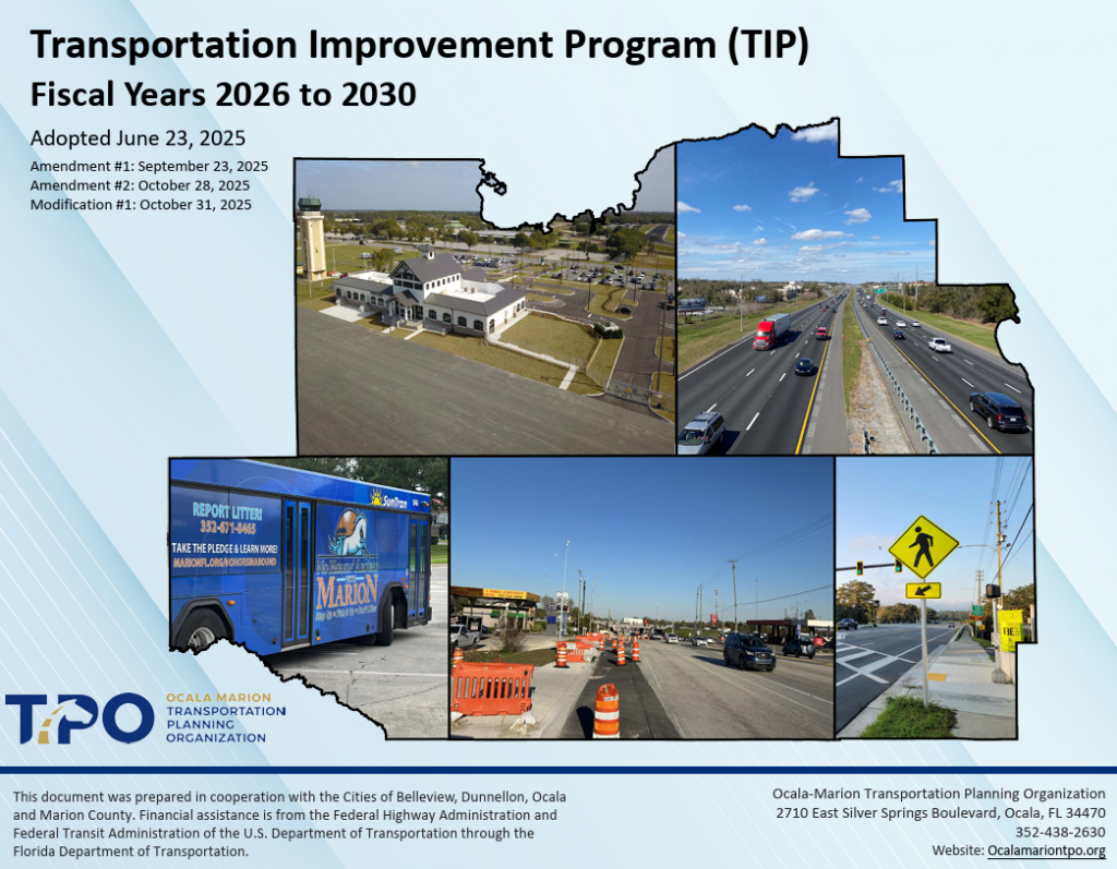 The Transportation Improvement Program (TIP) serves as the short-range transportation planning document for Ocala/Marion County. Updated and approved annually by the Board, the TIP outlines a detailed list of projects programmed for funding through the TPO process over the next five years. The types of projects in the TIP include all modes of transportation, such as roadway construction, operations, maintenance, repaving, bicycle and pedestrian, transit and aviation. Overall, the TIP serves as the budget for carrying out specific projects designated as priorities in the Long Range Transportation Plan (LRTP).