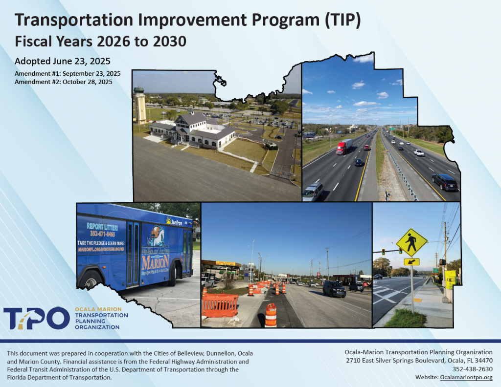 The Transportation Improvement Program (TIP) serves as the short-range transportation planning document for Ocala/Marion County. Updated and approved annually by the Board, the TIP outlines a detailed list of projects programmed for funding through the TPO process over the next five years. The types of projects in the TIP include all modes of transportation, such as roadway construction, operations, maintenance, repaving, bicycle and pedestrian, transit and aviation. Overall, the TIP serves as the budget for carrying out specific projects designated as priorities in the Long Range Transportation Plan (LRTP).